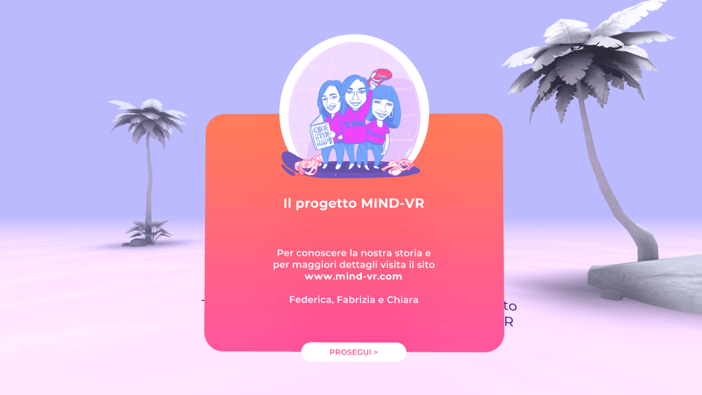 MIND-VR is a project born in March 2020 as a proposal selected within the second edition of the call #BiUniCrowd of the University of Milan-Bicocca in collaboration with the platform Produzioni dal Basso (https://unimib.produzionidalbasso.com). The project was conceived by Federica Pallavicini, Fabrizia Mantovani and Chiara Caragnano, three psychologists expert in the use of virtual reality and video games for psychological well-being. Our goal is the design, development, and experimental testing of a virtual reality psychoeducational experience on stress and anxiety – which is available free of charge both in Italian and English since October 2020 – for the psychological support of healthcare workers involved in COVID-19 emergency.